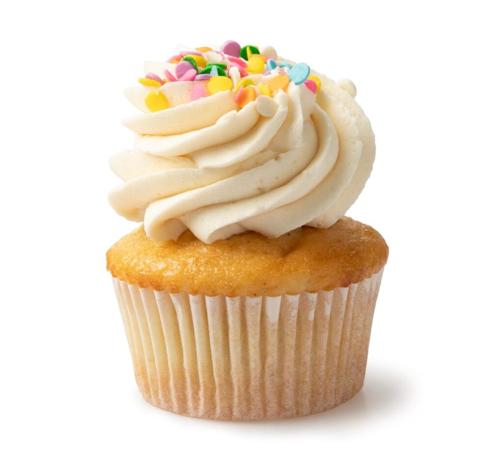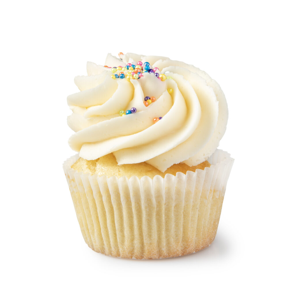 A classic favorite, featuring a soft, fluffy vanilla . Topped with a swirl of creamy vanilla buttercream and rainbow sprinkles, it’s light, sweet, and delicious.